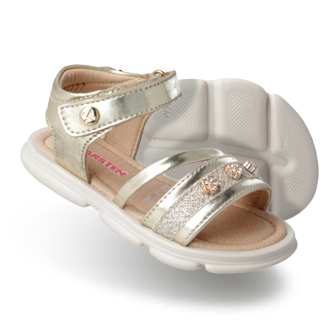 La sandalia Karsten para niña combina comodidad y un diseño delicado que aporta un toque especial a cualquier outfit. Su acabado metálico en tono dorado y los detalles brillantes con aplicaciones en forma de flor crean un estilo elegante y divertido ideal para ocasiones especiales o uso diario.